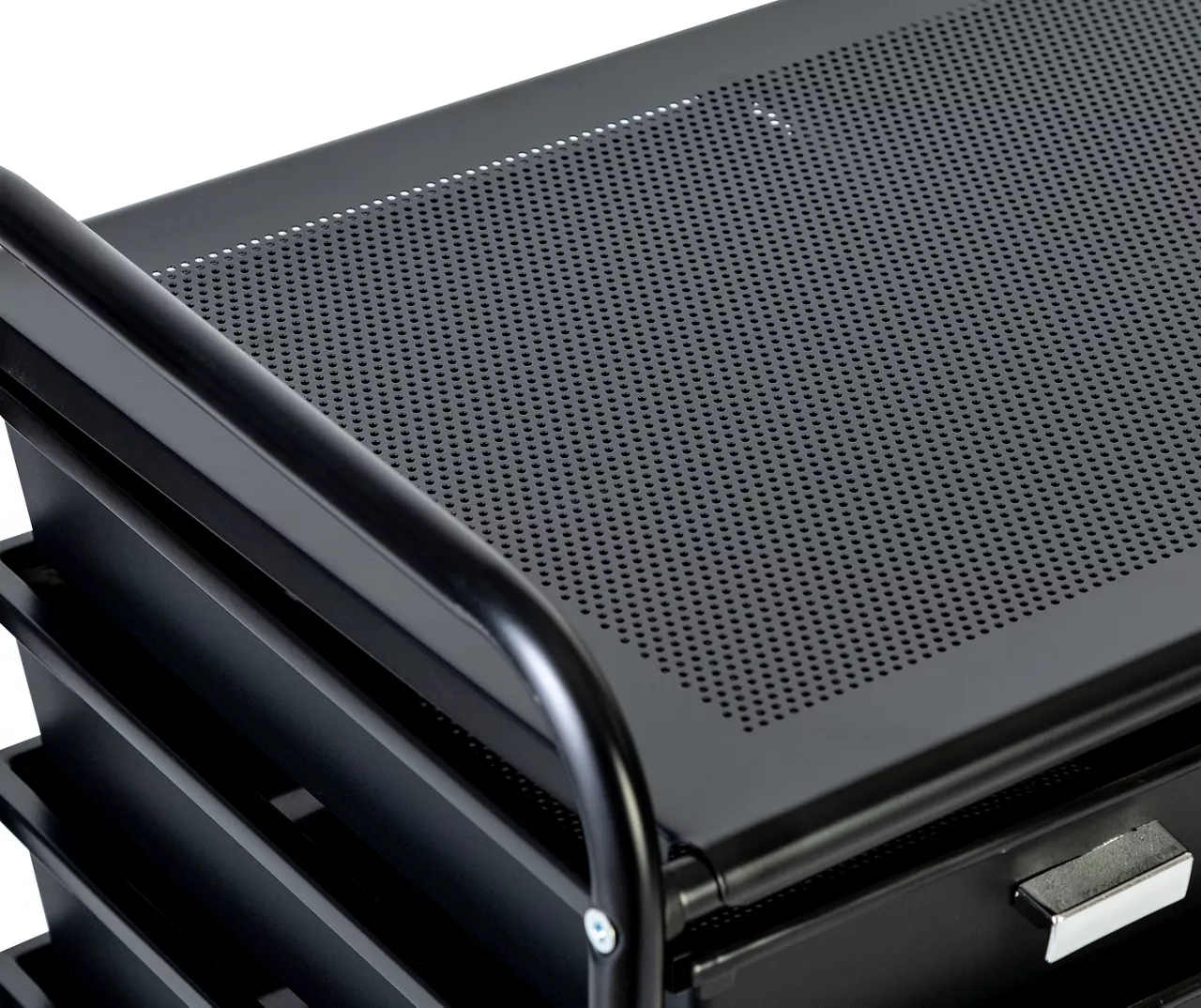 - Locking wheels secure the cart to work on its ample tabletop surface