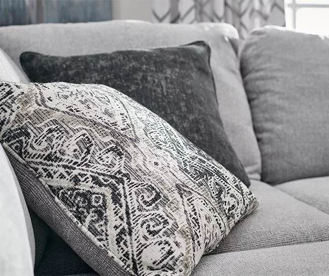 The overscaled Parkdale sectional features a dual chaise configuration that gives everyone a comfy seat. The soft chenille upholstery fabric in a light gray color tone is accented with a mix of patterns and textures on the five toss pillows. Designed with sleek lines and contemporary flared arms, the Parkdale dual chaise sectional will add style and comfort to any family room or living area in your home.