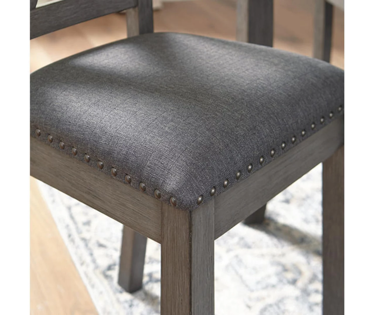 - Foam cushioned seats with linen-weave polyester upholstery and nailhead accents