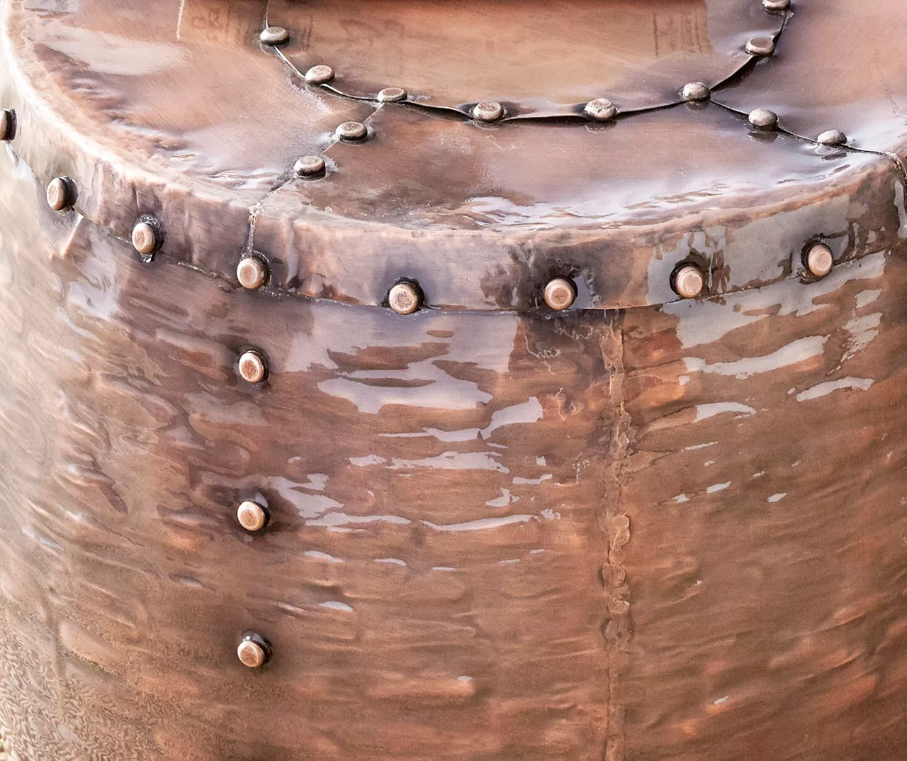 Introduce your home to bold, industrial design using this Cooper round end table. Iron with a gleaming hammered copper painted finish with rivet accents inspires striking visuals next to living room, family room or den furniture.