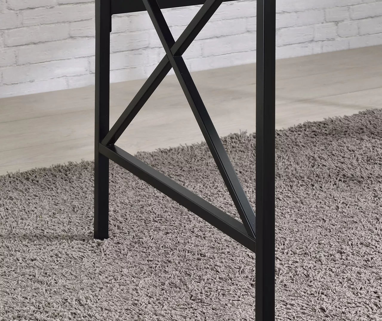 - Powder-coated iron tubing frame in black with geometric accents