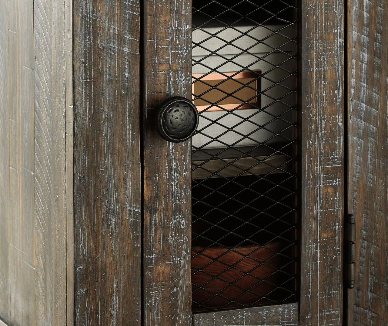 This fantastic chairside end table is crafted from solid pine wood in a complex finish melding gray and brown hues. Distressed with a light wire-brushed texture, it infuses a farmhouse element in your home complete with its cabinet door featuring a wire mesh front.