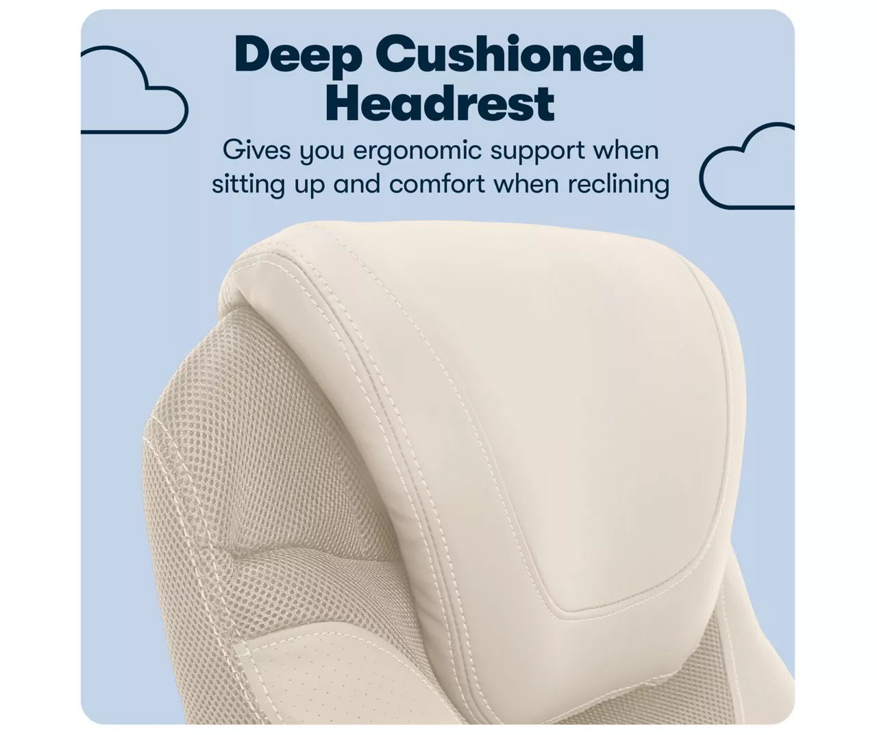 - Deep, layered body pillows and padded headrest for cushioned comfort