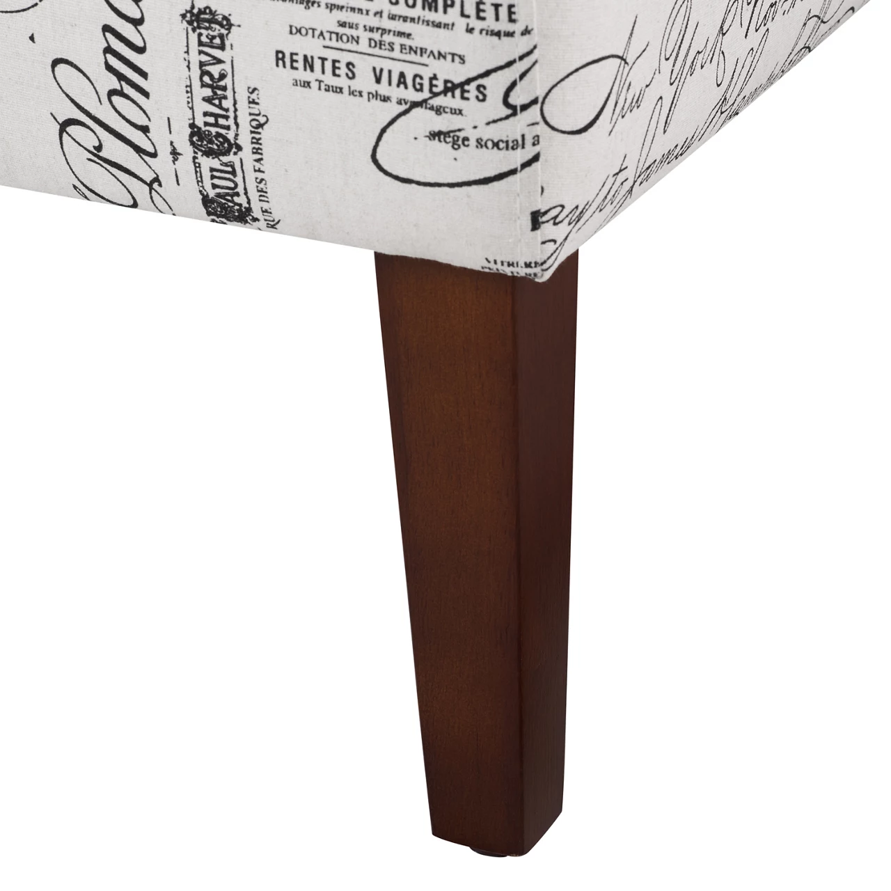 This Shelby chair is a stylish seating option for any room in your home. A plush seat and back is upholstered in a printed script linen featuring French phrasing and words. Constructed with a unique armless design, this chair is a stylish way to add function and pattern to your space.